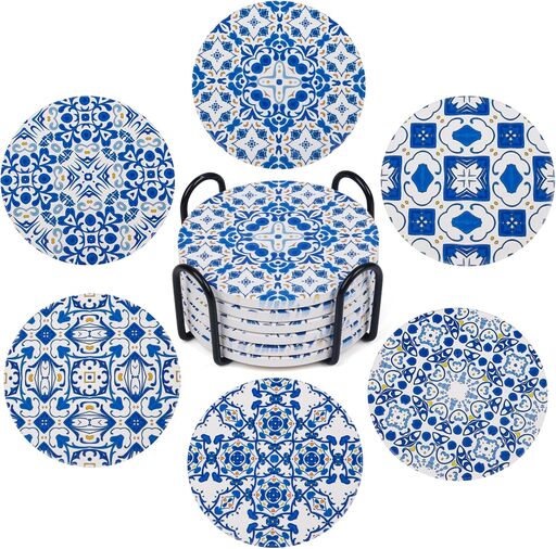 These absorbent ceramic coasters deliver exceptional functionality with an elegant blue and white porcelain design, featuring a convenient metal holder and anti-slip cork bottoms. Customers consistently praise their moisture absorption, durability, and aesthetic appeal, making them both practical and decorative for any home setting. At an affordable price point with great ratings across over 100 reviews, they represent outstanding value for functional home décor.